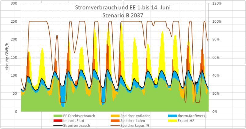 Bei EE-Überschuss werden zuerst die Batterien geladen und dann Strom für die Elektrolyse bereitgestellt. Wird die Elektrolyseleistung von 42 GW überschritten geht der Rest in den Export.
